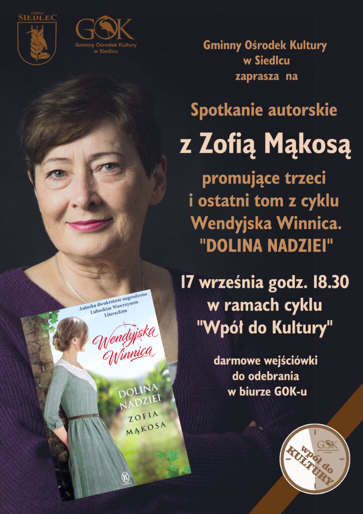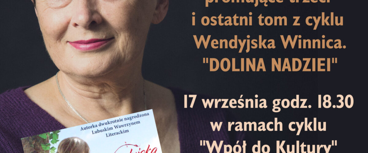 Zapraszamy do spotkania z p. Zofia Mąkosą autorką powieści z serii „Wendyjska Winnica”. Do tej pory wydano trzy części książki. Tym razem pani Zofia przedstawi nam ostatnią część tego cyklu pod tytułem „Dolina Nadziei”